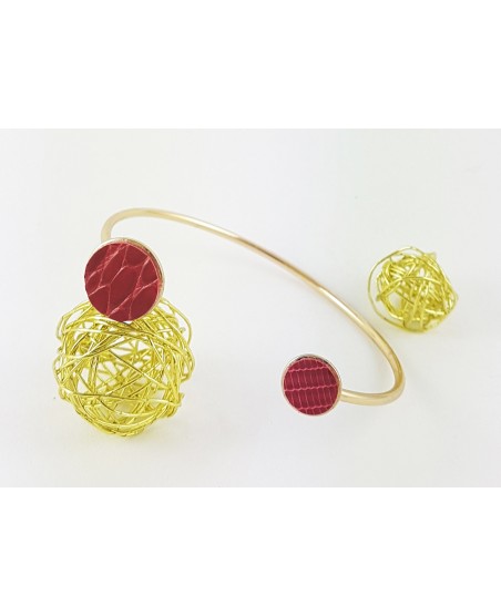 Bracelet jonc doré avec empiècements alligator et lézard rouge.