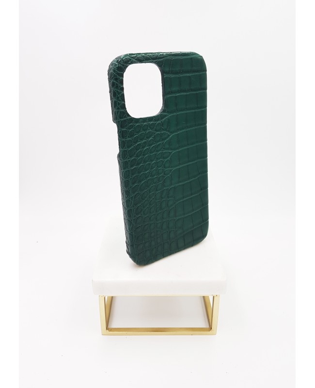 Coque pour Iphone 14 pro en cuir d'alligator de Louisiane de couleur vert anglais.