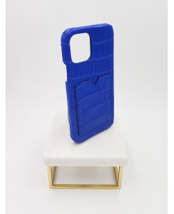 Coque card holder pour Iphone 14 pro en cuir d'alligator de Louisiane de couleur bleu électrique.