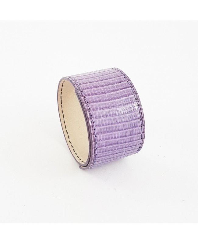 Bracelet manchette amovible en lézard parme et doublure veau beige anti-allergène.