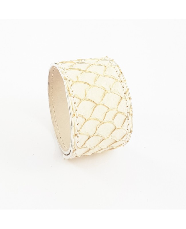 Bracelet manchette amovible en tilapia écru / liseré doré et doublure veau beige anti-allergène.